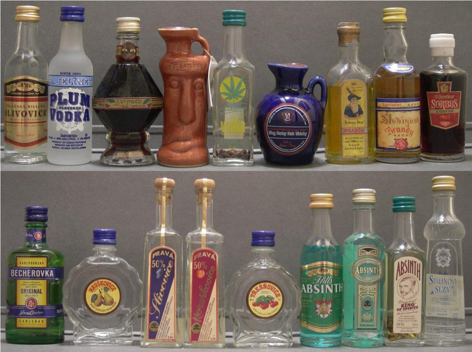 en esta republica encontramos bebidas como la absenta (1792 trul absinthum, fruko schluz, havels 60, hill´s absinth, inth ium delir thujon 35, king of spirits, prazky prague absinth, red absinth horka lihovina, red absinthum trul, staroplzenecky, stromu, zelena muza), aguadrientes como merunkovice (de albaricoque), hruskovice (de frutas), kakaovy liker (de cacao), luhacovicka r jelinek (de hierbas), pear williams brandy (de pera), william d’or williamsbirner (de pera), sorbus (de bayas), el bitter típico del país carlsbad becherovka, brandy (kemény, slovignac ****, vialco **), ron (korzar, pet set korun ceskych, sandokan, tuzemàk svejkuv), slivovice brandy (vyrobeno praveho, rodolf jelinek, slivovice valasska hillova), vodka (cannabis, eva zen sen, fischer, havluv plac strong, plum vodka r jelinek, prostejovska starorezna, stalinovy slzy, zubrovka), whisky (gold cock, king barley), licores egri viz 1877, arrika marianskolazensky, raketa, unikat, l. v. griotte cherry (de cereza), maraschino bylinny praded, maraschino praded pravy, hobe curacao (de naranja), green menthe (de menta).