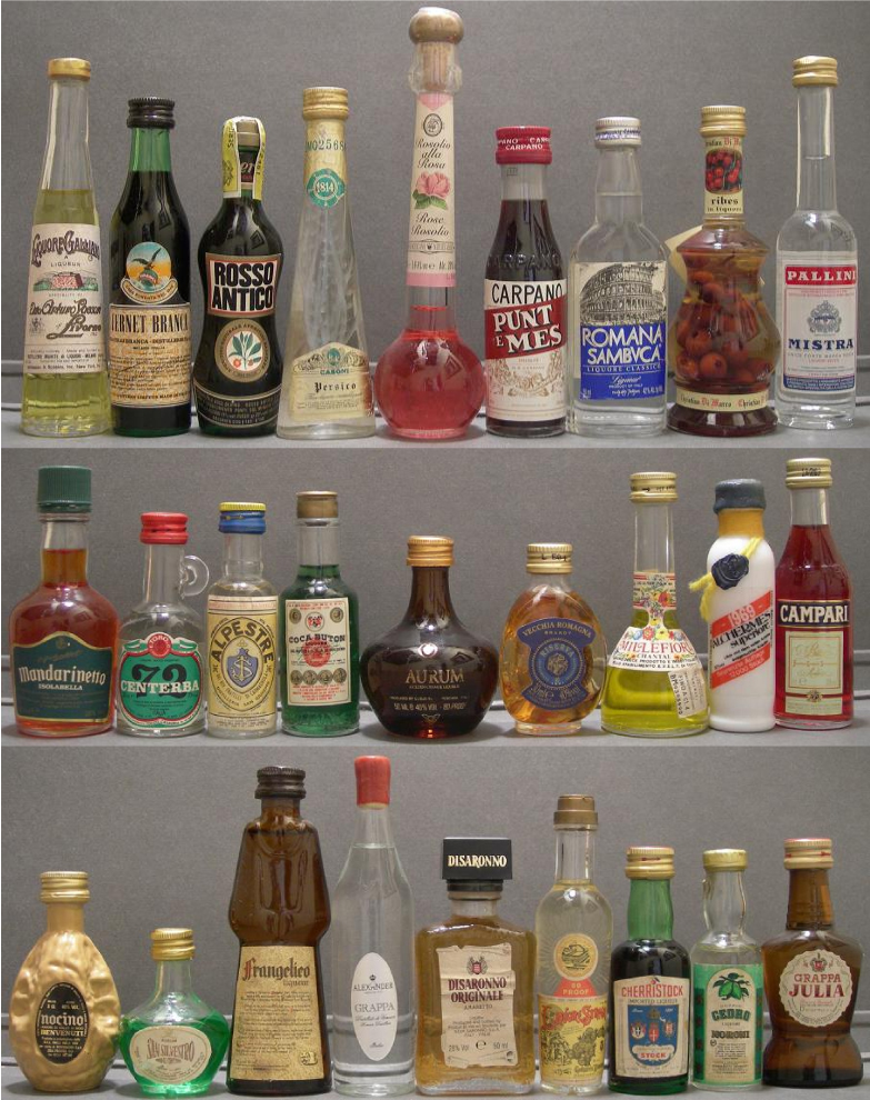este país europeo es uno de los grandes productores de licores típicos en miniatura, destacamos licores y aguardientes como: amaretto (3 vecchi, casoni, luxardo, disaronno, evelt, florio, galliano, libarna, stock), amaro (appennino di cicco, boario kernunos, casauria, ciociaro, cora 1835, del piave, don bairo, francescano di assisi, isolabella 18, lucano, montenegro, morandini, ramazzotti, tartufo nero di norcia, zara vlahov), anis (anesone leroux specialita, mistra pallini, stock anisette, rosso antico ), bitter (branca menta, campari, gancia americano), brandy (3 valletti, branca stravecchio, cavallino rosau, morandini, mouquin, seb morandini, stock 84, stock cordial, vecchia romagna), champagne (chianti, don carlos rosso, gardenia, la cacciatora barbera d´asti, montepulciano, moscato oltrepo), eau de vie (camel prunelle di prugne, ramasin slivovitz acquavite di prugne, nettarina pura acquavite di pesche, framboise infosio di lamponi, william grivès di pere, williams acquavita di pere williams), fernet-bitter (fernet branca, fernet superiore, luxardo, morandini rimonato, stock fernet), genepy-hierbas (casoni genepy, morandini genepy) uno de los aguardientes mas apreciados italianos la grappa (alexander, bonollo, andrea da ponte, bernard conegliano, bocchino, carpene malvolti, casauria, de bernard conegliano, dolzan, esatta grappa sibona, lucia, fior di vite, francescana, francoli, frattina, gambarotta, naura assisi, inga, ivta, julia, ladoppia isolabella, libarna, mangilli, marolo barolo, morandini, natalini, palladio, piave, piccadilly, ponte vecio, bonaventura maschio, roner, sarpa di poli, toschi, vite d´oro, giarola, prealpina), sambuca ( 3 vecchi, arcola, bora, buton, centerba 72, di trevi, galliano, evelt, isolabella, lucano, molinari, morandini, oblio, opal nera, ramazzotti, romana, sarandrea, strega, toschi), vermouth (blackberry julep, buton dry, cinzano bitter, cinzano, cherry julep, gancia rojo, gran torino, isolabella, martini, put e mes carpano, stock), vino (anno santo, asti, chanti), vodka (keglevich, kraslawa, mezzaluna, roberto cavali, zone), whisky mark one rare, licores (casoni, ciao hliquore, christian di marco, lacrima christi, marchesi gualtiero, napoleon fine sec, sciarada, ti amo salute, zambelan), licores de hierbas (casoni millefiori, alchermes boero, aperol barbieri, baby bomba millerbe, casoni certosa, centerba 72, certosa di firenze, certosino val d´ ema, coca buton, edelweis fior delle alpi, ferro china, fior d´alpe isolabella, florenza, francescano nero al cartufo, galliano, gocce imperiale certosa, grande chartreuse, millefiori chantal, millefiori di cucchi, morandini elisir china boario, roiano, strega), licores de limón ( doppio cedro, elixir di limone, gran limone, limoncello della costiera amalfitana, pallini limoncello, melodie di amalfi, syrenuse, villa massa), nocino (casoni, gavioli, toschi, zambelan vim pistta), ron (creola rhum fantasia, se si bon, saint gilles rhum), licores de diferentes frutas, hierbas y otros como: carciofo (de alcachofa), frangelico (de avellanas), carezza cappuccino (de cafe), sarandrea (de cafe), stock cherristock (de cereza), christian di marco prugna (de ciruela), tom boy (de chocolate), camel raspberry (de frambuesa), fragolino tutti frutti (de fresa), tao ginseng san russi (de ginseng), christian di marco ribes (de grosella roja), christian di marco fichi (de higos), christian di marco pannochietta (de maíz), mandarinetto isolabella (de mandarina), elixir bonomelli alla camomilla (de manzanilla), casoni persico (de melocoton), morandini pesca (de melocoton), aurum (de naranja), gran gala (de naranja), lacrime d´ oro (de oro), mezzetti d` altavilla (de oro), christian di marco peperoni (de pimenton), chinamari china calisaya (de quina), my rose angelo centenari (de rosas), christian di marco pomodori (de tomate), persicum (de melocoton), tuaca (de vainilla), marsala, nocello toschi walnut liquor (de nuez), casoni cristalizzato (de menta), rosolio (de rosas), sabajon vov zabajone.