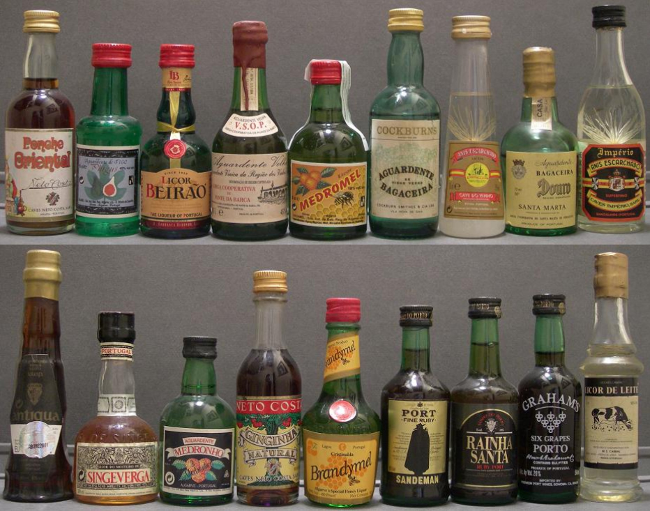 En este país del sudoeste de Europa encontramos miniaturas de licores típicos como el vino de oporto (calem, castle j, cockburn´s, dow´s, graham´s, isabel rose, kopke, lagrima, messias, offley, paul masson, rainha santa, sandeman, taylor, warre´s, lancers), absenta (extracto d absinto neto costa), aguardente figo (phigus aguardente de figo), aguardente medronho (3 medronhos castelo silves, 3 medronhos, sao bernabe), aguardente vinica ponte de marante, aguardente velha (aguardente velha vsop, alianca, antigua vsop, barrocao vsop), anís (cave do vinho anis escarchado, dómúz super extra, imperio escarchado, victoria anisado), bagaceira (aguardente genuina bagaco minho, cockburns aguardente de vinho verde), gin (ancora, old parente),licor cereza ginjinha (com elas ginjinha, ginja msr, neto costa ginghina natural), singeverga licor do mosteiro (de hierbas), brandymel cristinalda (de miel), vodka (bolchoi, nikolaska), licores dómúz amendoa amarga (de almendras),cherry portucale (de cereza), parente (licor de chocolate), tangará aperitif, carmel, ponche oriental neto costa.