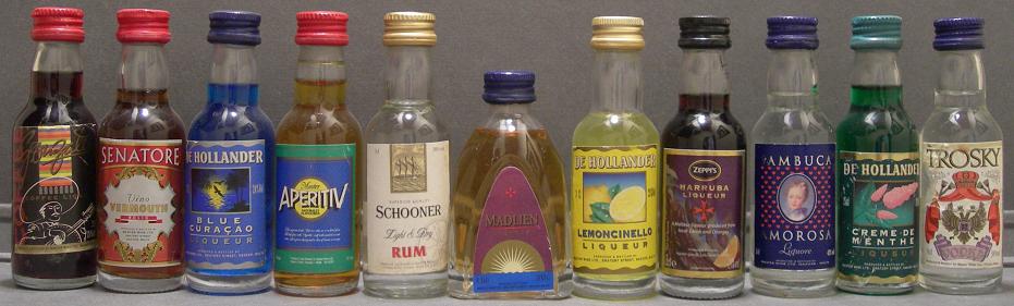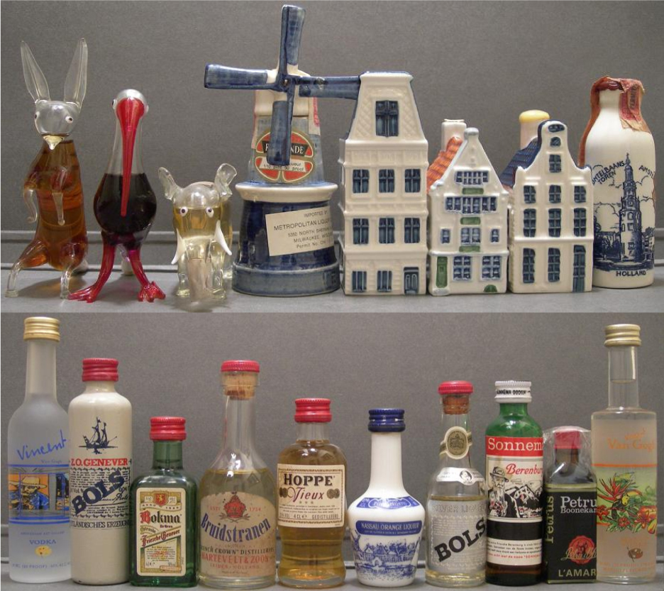 En los Países Bajos, reconocidos mundialmente por su amplia producción de licores y aguardientes, la colección cuenta con una gran variedad de miniaturas, entre las que destacan el jenever (Bokma, Bols, Bols Oude, Bessen, Peterman, Rynbende Jonge, Claeryn Jonge Genever), el gin (Damrak, Leyden, Silver Top), el vodka (Cardinal, Ketel One, Royalty, Ursus, Vincent Van Gogh, Ivanabitch Premium, Vox, Sonnema Herb, Purus) y el corenwyn-gin (Bols Corenwyn). También se incluyen licores como crème de menthe, parfait amour, pisang ambon, Kontiki, crème de noyaux, Godiva, curaçao, brandy Hoppe Vieux, kummel Bols, advocaat (Bols Advockaat, Parrot, Warninks De Roemer), ron Bootz, así como una gran variedad de licores especiales: Fladderak, Kwartier Voor Vijven, Bitterkoekjes, Bols Kummel Karwÿ Likeur, Vergeet Mij Niet, Everglo, Ke-Ke Beach, Kibowi, lychee Kwai Feh, Van Berckel’s Very Fine, Vieille Maison, Vieille Liqueur Jaune Angelique, Cherry Whisky y Amanda. Entre los licores de hierbas destaca el Beerenburg (Soonema, Meekmaatje It Goud Fan Frysland), y en la categoría de curaçao se encuentran Pimpleltjens De Kuyper, De Kuyper Orange y Bols Blue Curaçao. Otros productos representativos son el Agwa Herbal Liquor Coca, el Godiva de chocolate, el Vandermint (licor de menta con chocolate), el Bruidstranen (de oro), el Silverwasser (de plata), el Goldwasser (de oro), el Pisang Ambon de plátano y el Petrus Boonekamp de hierbas. También forman parte de la colección las emblemáticas miniaturas en cerámica Blue Delft de la aerolínea KLM, junto con licores de marcas icónicas como Bols, De Kuyper, Herman Jansen, Rymbende, Nolet y Dirkzwager Distilleries.