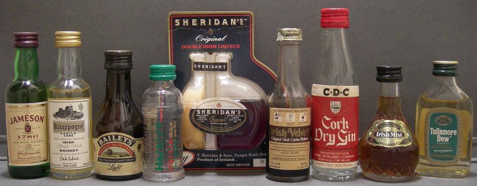 Lo encontramos representado por las miniaturas de: whiskey irlandes (clontarf, dunphy`s, hennessy malt, jameson, kilbeggan, michael collins, paddy old irish, tullamore dew, bushmills, knappogue castle), licor de whiskey ( bradys irish cream, brittle, celtic crossing, saint brendan´s, sheridan´s, waterford cream, baileys, irish coffee mix, irish mist, irish mist grelands, o´darby irish cream), vodka (boru, huzzar), el aguardiente clandestino o moonshine poteen (hackler poitin), licor café (carolans coffee cream, gallwey´s).