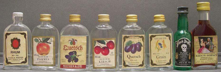 El gran ducado de Luxemburgo esta representado por miniaturas de aguardiente eau de vie(eau de vie de grain, eau de vie de kirsch, eau de vie de pommes, quetsch mathes & cie, quetsch r munchowen), ron kieffer rhum, vodka black death y el licor de cereza kirsch whisky difrulux.