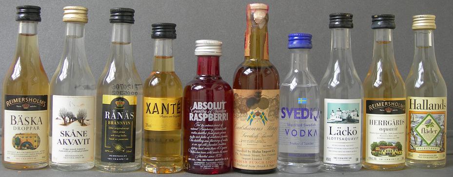 El Reino de Suecia esta representado por las miniaturas de aquavit (herrgards, op anderson, skane, swedish aquavit absolut rent brannvin), brannvin (bäska droppar, ranas), vodka (absolut, saturnus, level, stockholm, svedka, thor´s hammer), sambuca hallands fläder falkenberg, swedish punch carlshamns flagg arrack.